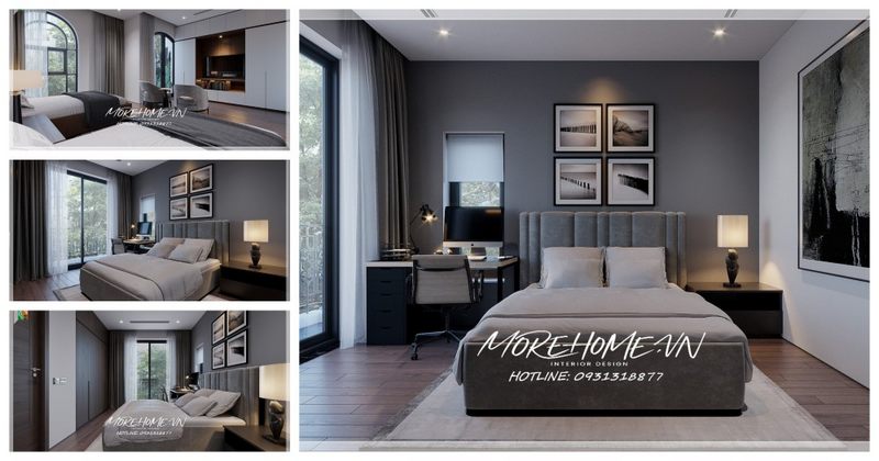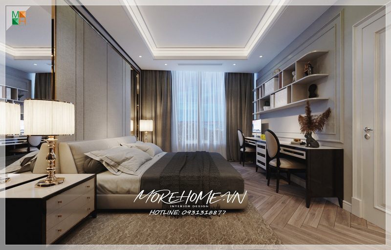 Phòng ngủ được trang trí mẫu bàn bằng gỗ có diện tích dài vừa là nơi làm việc mà còn vừa là nơi ngồi đọc sách, thư giãn với sự kết hợp trên cũng đã tạo cho không gian phòng ngủ không bị trật trội và bí bách trong không gian.