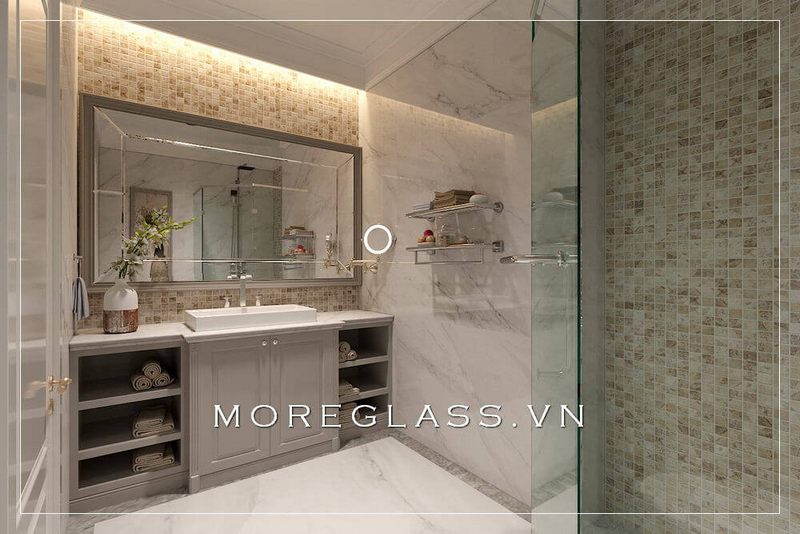 Gương treo tường tân cổ điển với kích thước lớn cơi nới thêm cho không gian phòng tắm thêm rộng và thoáng hơn