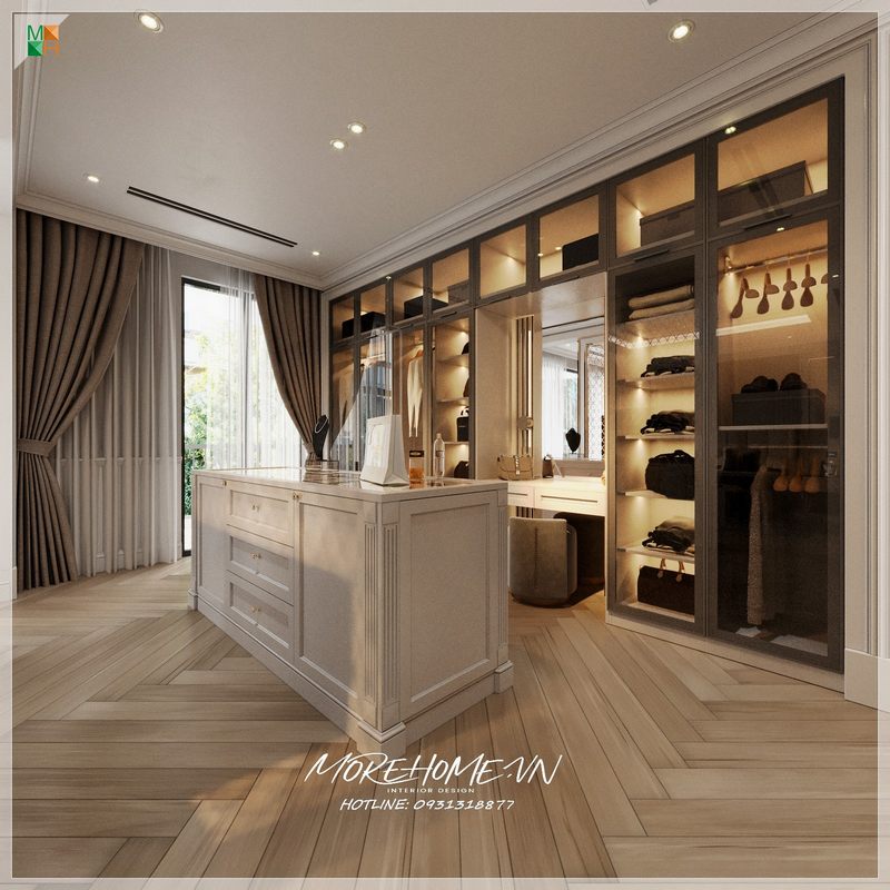 Gương trang điểm kết hợp trang trí tiện lợi trong phòng ngủ cao cấp mang phong cách tân cổ điển của nhà phố, biệt thự.